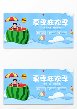 卡通手绘夏季海边游泳夏日狂欢季冲浪展板设计