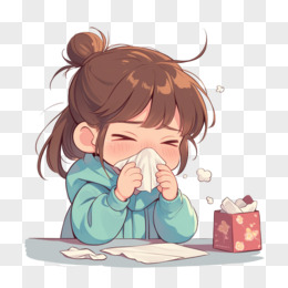 卡通女孩在桌边用纸巾擦鼻子免抠元素