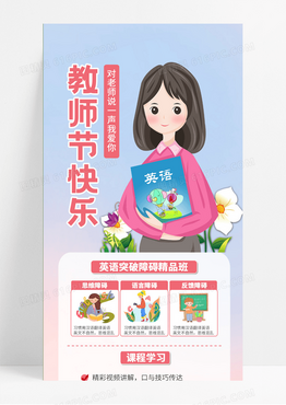 蓝粉渐变卡通简约插画风教师节快乐手机长图