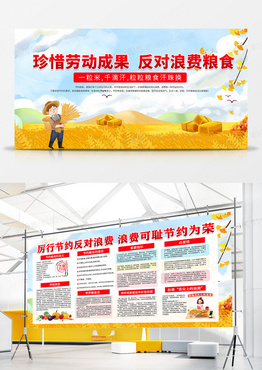简约时尚蓝天卡通麦子节约粮食展板反对浪费粮食展板宣传栏