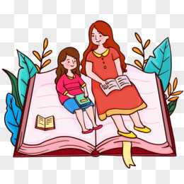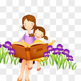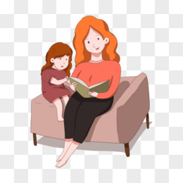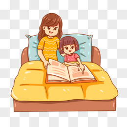 卡通手绘母女睡前阅读亲子阅读场景素材