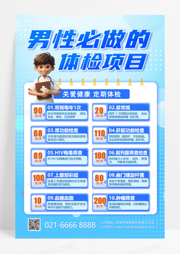 蓝色创意简洁卡通男性体检必备项目手机文案海报
