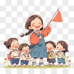 卡通老师拿着小旗带着小朋友旅行免抠元素