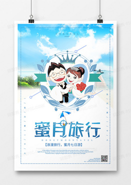 蓝色海边蓝天情侣婚纱卡通简约风旅行蜜月游海报