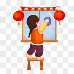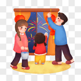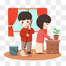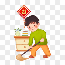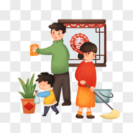手绘卡通小年习俗家人一起大扫除场景免抠素材
