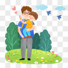 手绘卡通爸爸抱着儿子户外游玩插画免抠元素