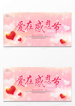 粉红色小清新爱在感恩节感恩节卡通人物爱心桃气球宣传展板设计