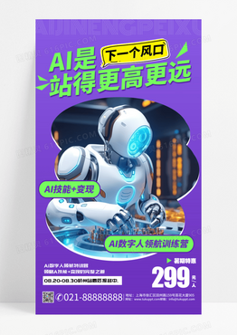紫色简约风AI课程营销宣传卡通3D立体人物手机海报