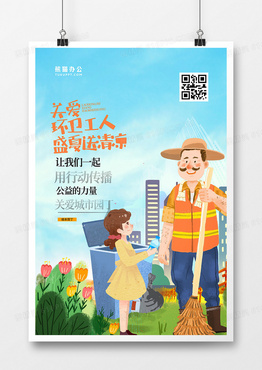 手绘关爱环卫工人盛夏送清凉公益海报设计