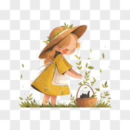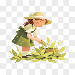 卡通手绘春天开心采摘茶叶的少女免抠元素
