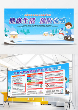 蓝色手绘卡通冬季预防流感健康生活宣传栏