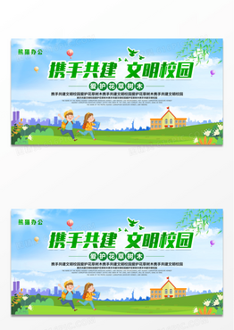 清新简约卡通携手共建文明校园爱护花草树木校园展板设计