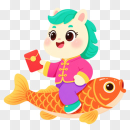 卡通一个小马抱着金鲤鱼免抠元素