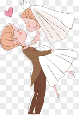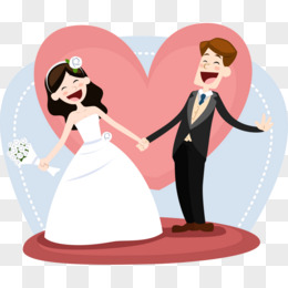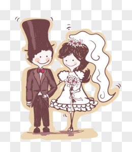 卡通穿白色西服婚纱的新郎新娘和一只狗免抠元素