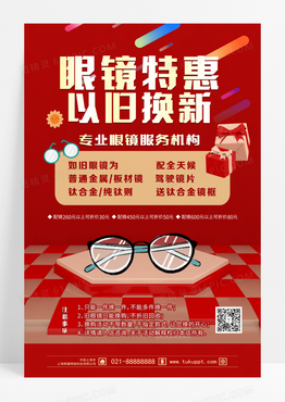 红色背景卡通风格眼镜特惠以旧换新促销海报眼镜海报设计