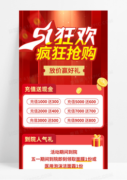 红色大气渐变卡通医美简约光效51狂欢疯狂抢购手机长图劳动节长图