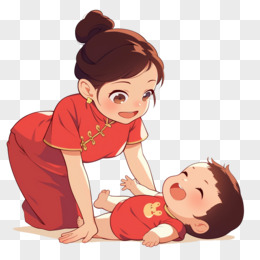 3D卡通床红色短袖旗袍的母亲抱着婴儿免抠元素