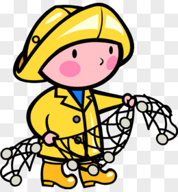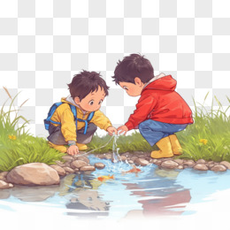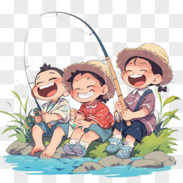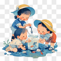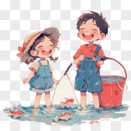 卡通手绘多人小朋友下水捕鱼免抠元素