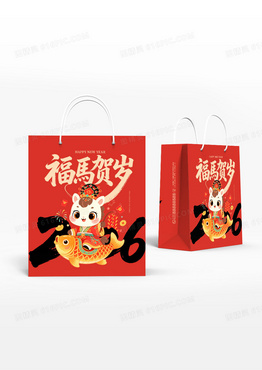 红色卡通2026马年新年福马贺岁手提袋马年纸袋
