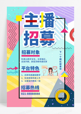 粉蓝色扁平化卡通人物主播招募宣传海报主播招聘