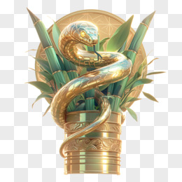 3D卡通新年装饰元素金色蛇和一盆竹子免抠元素