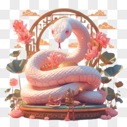 3D卡通新年装饰元素白色蛇和荷花免抠元素