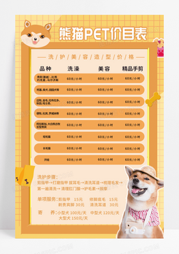橙色可爱宠物洗护美容造型宣传海报宠物店价格表
