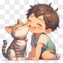 卡通风宠物小男孩和小猫脸贴脸免抠元素