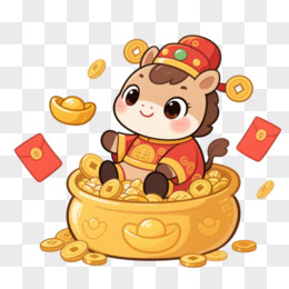 卡通一个穿着财神衣服的小马坐在聚宝盆里免抠元素