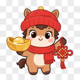 卡通戴着红色帽子和围脖小马拿着金元宝和中国结免抠元素
