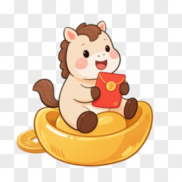卡通一个坐在铜钱上的拿着红包的小马免抠元素