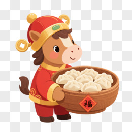 卡通一个穿着红金色衣服帽子的小马抱着一木盘饺子免抠元素