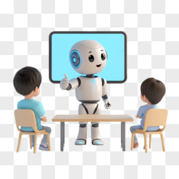 3D插画一个机器人站在屏幕前给两个小朋友讲课免抠元素