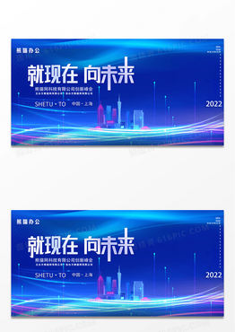 大气蓝色光效2022年企业年会公司创新峰会就现在向未来展板就现在 向未来2022大气炫酷企业科技感展板设计