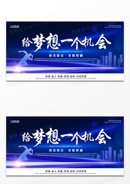 大气蓝色背景线条光效城市剪影蓝色科技给梦想一个机会招聘展板招聘会海报