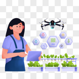 插画一个带着绿色围裙的女人站在蔬菜大棚旁边操控手机免抠元素