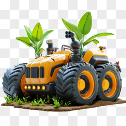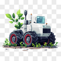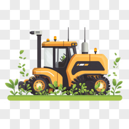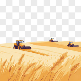 插画金色的田地里几辆收割机在收割作物免抠元素