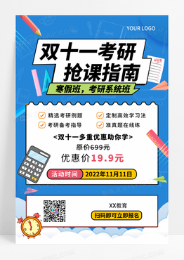 蓝色卡通双十一考研抢课指南双11购课课程促销海报培训班双十一