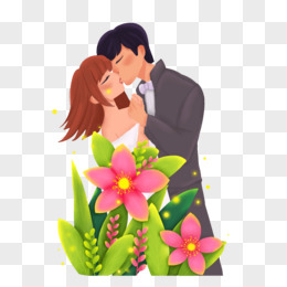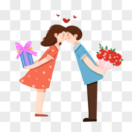 卡通情侣接吻手捧鲜花免抠素材