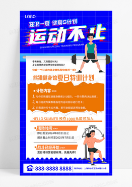 蓝色动感简约动感插画狂浪一夏健身S计划夏日健身促销手机文案海报夏天