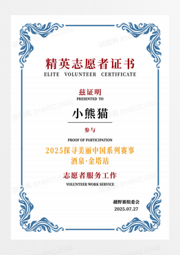 蓝色花纹精英志愿者荣誉证书奖牌志愿者证书