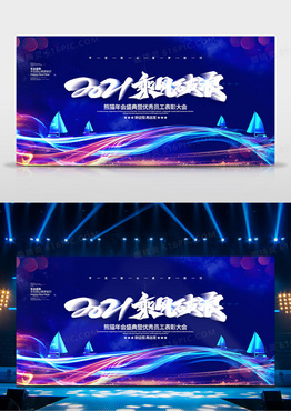 蓝色炫彩大气2021乘风破浪年会背景展板设计