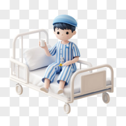 3D插画穿蓝色病人服的病人坐着病床上吃药免抠元素