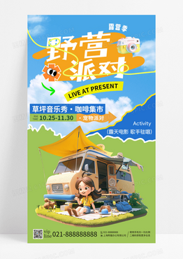 蓝天白云野营派对露营季草坪音乐季手机海报