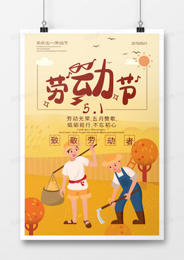 淡黄色劳动农民矢量图树小麦太阳云飞鸟五一劳动节海报