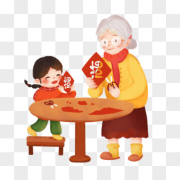 手绘卡通老奶奶教孙女剪纸花免抠元素