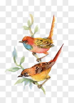 水彩画两只彩色的小鸟停留在开满石榴花的树枝上嬉闹免抠元素