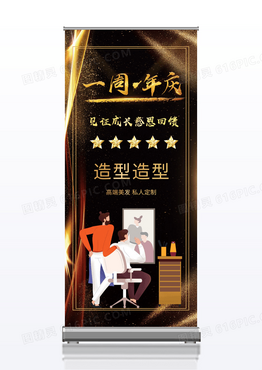 黑金色简约风一周年店庆高端美发私人订制易拉宝理发店周年庆