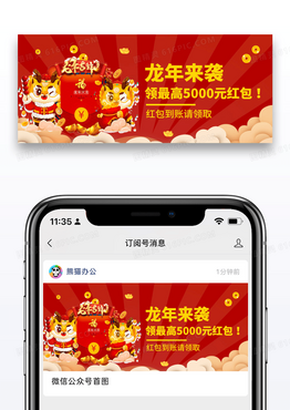 红色喜庆龙年来袭领取红包微信公众号封面图片