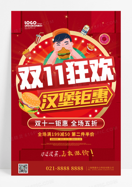 红色卡通插画双十一狂欢汉堡钜惠促销海报